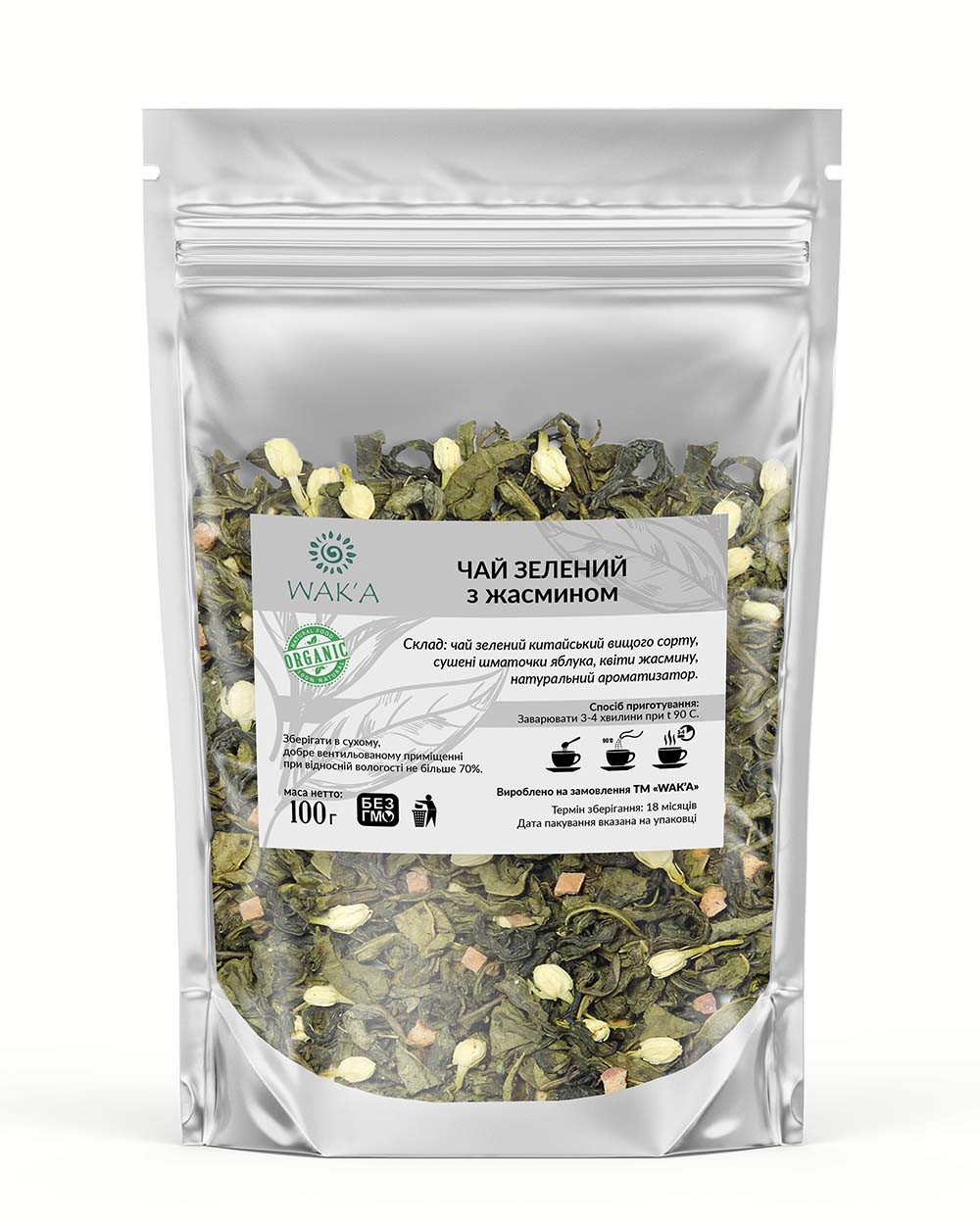 Чай зелений з жасмином – це зелений чай, до складу якого входять пелюстки жасмину та шматочки яблука. Без ароматизаторів Має яскравий свіжий смак і аромат жасмину у відтінку зеленого класичного чаю.